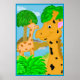 A fun illustration of two giraffes in a jungle paradise. This is a great poster for a child's bedroom. The background color is customizable.
