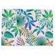 Lush tropical leaves seamless pattern in blue and green tones over a white background.