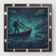 This is a stylized illustration depicting a lone adventurer in a narrow boat, poling their way down a jungle river. The artwork is rendered in shades of deep blue and vibrant teal, giving it a mystical, nocturnal feel. Lush tropical foliage, distant mountains, and an overhead bird are all depicted with an embossed or woodcut-like texture. Several fish are visible in the glowing water near the boat.