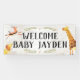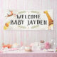 Decorate your baby shower with this adorable jungle and safari themed baby shower banner featuring an antelope, lion, and giraffe with the message "Welcome Baby" - customize it with the name of the baby on the way!