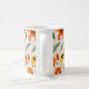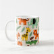 The mug features a seamless pattern of cartoon-style jungle animals against a light beige background. These animals include an orange tiger with black stripes, a mint green elephant, a yellow giraffe with brown spots, a green crocodile, and a brown turtle. Stylized green and brown leaves are interspersed throughout the pattern. The animals are depicted with simple shapes and bold outlines, creating a playful and whimsical design. The overall aesthetic is cheerful and vibrant, making it suitable for children's products or designs with a jungle theme.
