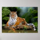 The jungle tiger, confident, powerful, and brave, rests by a tranquil stream as he waits for nightfall when he will stalk his prey to fulfill his day.