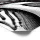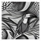 A toucan with a prominent beak is depicted amid swirling monochromatic patterns that evoke a sense of movement of jungle leaves. The high-contrast design accentuates the bird's features amidst the abstract shapes surrounding it.