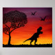 Sunset background with a black silhouette of a tree, a Tyrannosaurus Rex and two Pterodactyls.