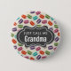 A button which says: Just call me grandma. Designed with a cute pattern of macarons in many different colors with a faint polka dot pattern behind.