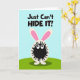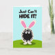 Designed with a simple, graphic look, this illustration centers on an egg-shaped bunny-like creature with cream ears and soft pink inner ear details 🐰. It stands on a rich green hill beneath a pale blue sky, keeping the setting open and uncluttered. The character’s wide, upward gaze and big black open mouth suggest a rush of feelings, like a friend blurting out something they’ve been holding back. Inky black tendrils curl out from the mouth area and around the face, adding a dramatic, almost breathless energy to the moment. Near the top, the phrase “Just Can’t HIDE IT!” appears in thick black letters with a dark shadow, spaced clearly against the sky. The creamy body, pink accents, green ground, and blue background create strong contrast, with the black details tying everything together 🌷. The ears sit high and rounded, with the pink centers facing forward above the small, stubby feet.