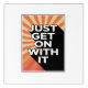 Just Get On With It Inspirational Motivational Acrylic Print. Vibrant acrylic print in black, white, yellow and orange, with the words, Just Get On With It. A fun and colorful design with words to encourage and inspire. Perfect for those facing challenges to move past fear and insecurity and tap into their inner strength and power. A great affirmation to overcome procrastination, build confidence, and Just Get On With It!
