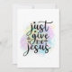 Inspirational quote scripture flat greeting card depicts a simple abstract watercolor background with pastel colors of blue, lavender and yellow brush strokes on a white background. It features the title of a Christian Worship song, "Just Give Me Jesus." The back Bible Verse 2 Corinthians 3:18, "But we all beholding the glory of the Lord with open face, are transformed into the same image from glory to glory, as by the Spirit of the Lord." The back verse and greeting prayer can be personalized or deleted for a hand written note.