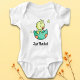 Simple baby bodysuit with an illustration of a yellow bird hatching from its green egg. Illustrated and designed by Patricia Alvarez.