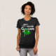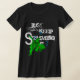 A Cute cartoon fish with a shark in the background with the words "Just keep swimming" on a t-shirt.
