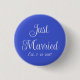 Button Pin casual fun fashion statement accessory printed with Royal Blue Color background and Just Married in White Color text typography lettering design by TheFabricSeal print on demand shop at Zazzle.com #ZazzleMade https://www.zazzle.com/store/thefabricseal TheFabricSeal©️Original.