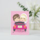 Groom and bride driving a pink automobile with a just married car plate and cans tied to bumper. Celebrate your wedding day with this cute and original design by Kakigori Studio.