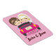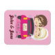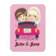 Groom and bride driving a pink automobile with a just married car plate and cans tied to bumper. Celebrate your wedding day with this cute and original design by Kakigori Studio.