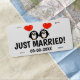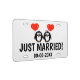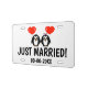 Just married funny penguin cartoon wedding car License Plate. Funny auto vanity plate for newly weds couple. Cute design with heart balloons. Also fun for honeymooners.