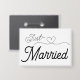 Just Married—fun wedding and honeymoon buttons (pins) for bride and groom. Announce your newlywed status to everyone. Elegant script font with a cute heart illustration. Simple and sweet black lettering.