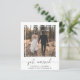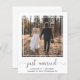 Chic budget-friendly elopement or private wedding announcement and reception invitation. The front features your wedding photo in a cut out square frame, "just married" in a stylish script with swashes and your first names and wedding date and location in modern typography. On the reverse side, you can personalize your wedding announcement, add a reception or celebration party invitation and sign your names in a signature-like script.