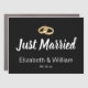 Interlocking faux (not foil) gold wedding rings are at the top. The white script says 'Just Married'. At the bottom, there's white text for the names of the bride and groom as well as the wedding date. The license plate is black.