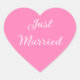 Sticker shown in the heart shape in the pink color with Just Married text in white.