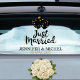Celebrate your first ride together as a married couple with this romantic Just Married car window cling with hearts.