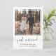 Simple and chic elopement or smaller wedding announcement and post-wedding reception or party invitation. The front features your photograph in a cut out square frame, "just married" written in a trendy script with swashes and your first names and wedding date and location in modern typography. On the reverse side, you can personalize your wedding announcement in more detail, add a reception or party invitation and sign your married names in a signature-like script.
