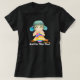This black tee shirt features a colorful image of a girl happily knitting a scarf. The caption "Just One More Row!" is prominently displayed underneath, in bold and playful lettering. This phrase is a popular mantra among knitters and is often used to encourage oneself to keep going and complete just one more row of a knitting project before taking a break.