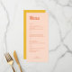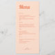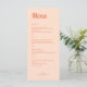 A wedding menu with orange retro typography on a peach background with a small sun design is a stylish and unique choice for a special occasion. The bold, bright orange letters stand out against the peach background, creating a striking visual contrast. The menu is further enhanced by the addition of a small sun design, adding a touch of whimsy and playfulness to the overall design. The sun design adds a cheerful vibe to the menu, making it perfect for a fun and memorable wedding celebration. The peach background and retro orange typography give the menu a vintage feel, making it a perfect choice for a retro-themed wedding. Overall, this wedding menu is a beautiful and unique choice for a memorable and special occasion.