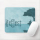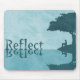 A green-blue textured drawing featuring the silhouette of a man sitting under a tree by a pond contemplating. The word "Reflect" rests on the lake's surface, the text and shadows reflected in the perfectly still water.