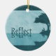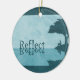 A green-blue textured drawing featuring the silhouette of a man sitting under a tree by a pond contemplating. The word "Reflect" rests on the lake's surface, the text and shadows reflected in the perfectly still water.