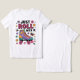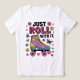 This white t-shirt features the text "JUST ROLL" in large, colorful, patterned letters above "WITH IT," in smaller black letters. Below the text is a vibrant illustration of a roller skate with purple, teal, orange, and pink elements, decorated with flowers, hearts, stars, and butterflies. The design is playful and encourages a carefree attitude.