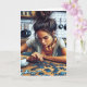 A cute card to send to a friend or family member. Just wondering how you are, let's catch up greeting card. Ai illustration of a woman doing a puzzle on her kitchen table.