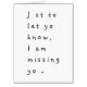 Sure to deliver a huge smile, "J st to let yo know, I am missing yo ." Sweet, funny, humorous, custom, personalized, awesome, big large giant huge jumbo size missing you card, that you may personalize with your own message / note / greeting inside. A sweet "missing you" card for the special someone, a lovely card for army wives and kin of armed forces personnel posted faraway, to say "I love you" and "I miss you" on birthday, anniversary, christmas, holidays, valentine's day, and more.