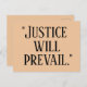 This is a nice salmon color postcard with a powerful message: 'JUSTICE WILL PREVAIL' printed in big black letters.