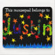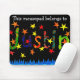 A good quality mousepad with a colorful handpainted paper collage design saying 'This mousepad belongs to Justin' on a black background. See also matching greeting card and gifts.