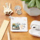 This cute keychain has a watercolor graphic with a coffee cup, book, and pretty orange daisies.