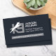 Minimalist and professional dog training business card featuring a bold K9 logo with a dynamic leaping dog silhouette. This sleek layout puts your name, certification, and website front and center, while the back offers full contact details along with a scannable QR code — making it easy for clients to connect instantly.