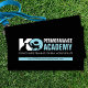 Modern and professional dog training business card featuring a bold K9 graphic logo paired with customizable text, making it ideal for trainers, academies, and canine professionals who want a strong and trustworthy image. The design includes space for a tagline or motto on the front, plus full contact details on the back, with subtle paw print accents for a polished touch.