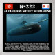 K-222 is a Soviet hunter - killer nuclear powered submarine. NATO designation: "Alfa Class". She displaces 3,200 tons submerged, Her top speed is 46 mph, Armed with 20 torpedoes & 20 SSN-15 cruise missiles. The power plant for the boat was a lead-bismuth cooled nuclear fast reactor. She was featured in the Movie "The Hunt For Red October".