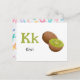"Letter K is for Kiwi" in our Alphabet Flash Card set. Get all 26 letters of the alphabet! A double-sided postcard that is great for memory games and teaching, geared for education, schools, teachers and homeschoolers for kindergarten and babies. All text is editable if you need to customize.
