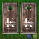 Bring a touch of rustic charm to your outdoor gatherings with this beautifully designed cornhole set. Featuring a rich, dark wood grain background, this design prominently displays a bold 'K' monogram framed by elegant flourishes. Below the monogram, add your family name to this elegant scripted, K monogram. Perfect for family reunions, backyard BBQs, or as a unique wedding gift, this set adds a sophisticated and personalized element to any event. The distressed wood look adds a farm house vintage feel, making it a stylish addition to your patio or lawn.