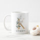 Letter K monogram floral. Letter K in golden brown texture accented with green watercolor compound leaves and berries and gold dust. Personalized with name in matching font.