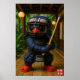 This image is of a stylized, Yanbaru Kuina bird-like character dressed in traditional kendo armor. The character wears a dark blue kendogi (uniform), a protective bogu (armor) with a face mask, and bright red shoes. Its face is a stylized beak, and it holds a shinai (bamboo sword) in its hands.