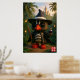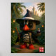 It wears a black wizard hat with a white band, and a black robe adorned with golden crescent moons and stars. In its left hand, it holds a small broom, and in its right hand, a tiny glass bottle containing a dark purple liquid. The bird also sports a striped undershirt.