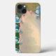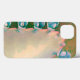 The abstract image on this iPhone 13 Case is an original photograph by MaeFlowers of a kalanchoe plant. The photo is a closeup, showing the new growth at the edge of the leaf, the little curled parts which fall off and become new plants. The leaf, normally bluish green in color, is aqua blue with pink edges and light yellow highlights. The older leaves in the background are dark to light green, with flecks of vermilion red, fading to pale orange.