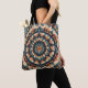 A vibrant geometric quilt pattern radiates from the center, creating an intricate mandala design with various colors including shades of teal green, rust brown, and beige