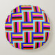 A bold, high-contrast geometric pattern built from repeating striped round pillow in vibrant hues of red, yellow, magenta, orange, and black. Each block alternates between horizontal and vertical stripes, framed by strong blue edges against a sky-blue background. The layout creates a woven, almost optical-illusion effect, as if the pattern is interlocking in a rhythmic dance of color and order. It’s playful, loud, and impossible to ignore.