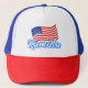 Kamala Harris for President Elegant Script US Flag Trucker Hat. For a Kamala Harris presidential campaign supporter design, a bold and empowering layout that combines typography and patriotic symbols to create a striking visual statement. At the center of the design, feature Kamala Harris's name in large, elegant typography. Use a modern font to convey a sense of forward-thinking and progress. To enhance the design's visual appeal, add a subtle, polished finish with a shadow effect, giving the typography a sense of depth and dimension. This approach not only highlights Kamala Harris’s name but also ensures the flag’s colors and patterns stand out vibrantly. This product aims to celebrate Kamala Harris’s candidacy with a strong, patriotic flair, using typography and the U.S. flag to create a powerful, supportive statement for her presidential campaign.