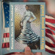 Kamala Harris for President! We're not going back!" postcard featuring a striking painting of a strong African American woman, confidently standing with a cat by her side. She wears a knee-length dress adorned with bold light blue and dark gray horizontal stripes that create an optical illusion, revealing a gold and white pattern. Her intricate dress accentuates her silhouette, embodying both elegance and power. The background showcases a complex, textured pattern that harmonizes with the vibrant colors and forms, making this postcard a captivating statement of resilience and leadership.
