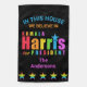 Add your name to this double sided Kamala Harris political garden flag in bright pride colors and show your support for Kamala Harris for President. This personalized garden flag is easy to customize: just add your name in a bright purple font at the bottom of the flag and create your own personal sign for the 2024 presidential election. Designed in bright rainbow colors on black, each custom garden flag is printed with IN THIS HOUSE WE BELIEVE IN in blue and orange text followed by KAMALA HARRIS FOR PRESIDENT in the pride colors, your name in purple and a bottom border of rainbow stars.
