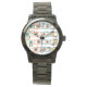 This women's watch has a Kandinsky inspired mid-century modern design of sets of rectangles formed by a continuous line each with an oval inside in retro colors of orange, brown, gold, and turquoise on a white background. If you like the design but prefer different colors, message me.