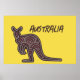 Poster features kangaroo silhouette in aboriginal mosaic pattern on yellow background with "Australia" in grunge style text